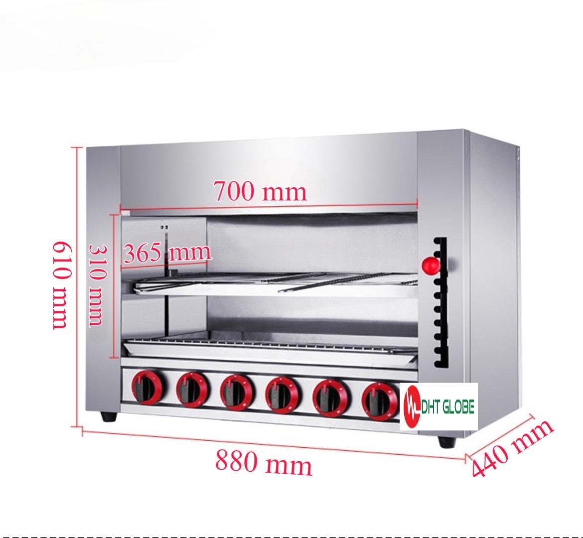 - Lò nướng salamander 6 họng gồm 6 họng gas, lò nướng có điều chỉnh nhiệt .