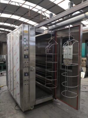 - Cho heo lên lồng treo để cố định vị trí rồi treo vào giá treo và đẩy vào bên trong buồng quay nướng rồi đóng cửa lò lại