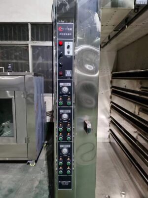 Đến với bảng điều khiển, thì mẫu lò này có thể nói là thiết bị sở hữu bộ bảng điều khiển với nhiều nút chức năng nhất của Bảo Việt hiện nay. Lần lượt từ trên xuống dưới, chúng ta sẽ có đèn báo lò hoạt động, công tắc bật chức năng xoay và điều chỉnh tốc độ xoay của lồng treo lợn, công tắc bật tắt đèn, công tắc và đồng hồ hiển thị thời gian quay nướng cài đặt, bộ điều khiển 4 dàn đốt phía trên và bộ điều khiển 4 dàn đốt phía dưới (gồm công tắc bật/tắt và đèn báo của từng dàn đốt gas, cùng với núm vặn nhiệt độ cài đặt và đồng hồ hiển thị nhiệt độ thực tế). Nhiệt độ cài đặt của lò có thể từ mức 0-400oC.