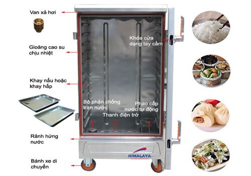 Nấu cơm, nấu xôi: Mỗi khay tiêu chuẩn nấu 3 kg,hoặc 4kg mỗi lần nấu ngon nhất 30 kg – 40 kg gạo thời gian từ 50-60 phút tùy loại gạo. Chú ý đối với khách hàng nấu gạo tấm thì lượng gạo nấu mỗi khay chỉ nên để 2.5 kg.